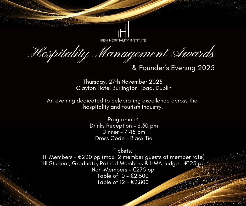 We’re thrilled to announce details for the IHI Hospitality Management Awards (HMAs) & Founder’s Evening 2025 this 27th of November at the Clayton Hotel Burlington Road.